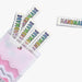 Each pack contains six woven labels featuring  rainbow letters with black outline on a crisp, white background.